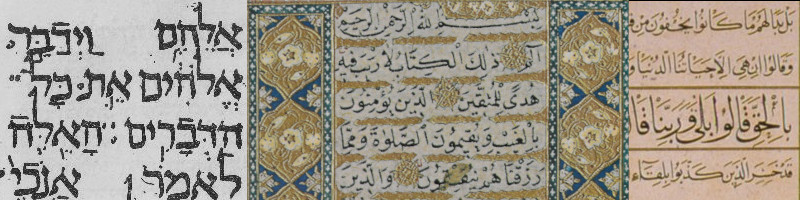 Excerpt or commentary from Book of Exodus (Sh’mot) in Hebrew. Surah al-Baqarah (The Cow) from Qur’an. Surah al-An’am (The Cattle, lit. Pleasant Things).
