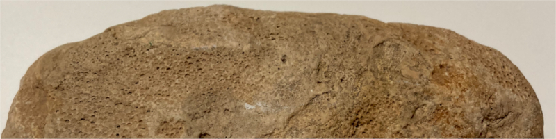 A stone demonstrating characteristics of weathered tabulate coral fossils [2] from the Paleozoic eon.