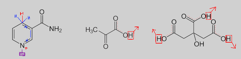 Red: Several H atoms leave to form the base equivalent, Citrate, one of the first molecules in the Krebs Cycle aka Citric Cycle, an important of the cellular respiration.
