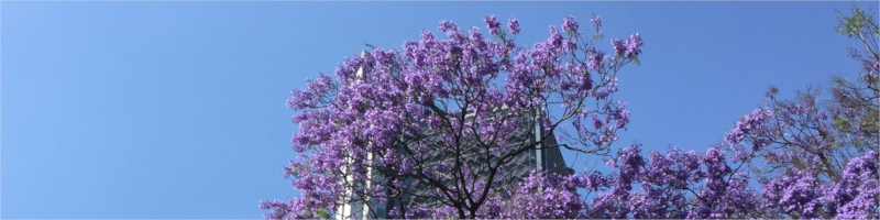 The Jacarandá tree, Jacaranda mimosifolia, is the most flamboyant flowering tree of springtime in Mexico City. It adorns many avenues and small city streets. Its flowers fall shortly after its bloom and decorate the dusty side walks and provide work to the city’s maintenance crews. Although it adorns much of the city, it is not native to the area, but instead originates from interior southern American regions and historic territories of the Spanish empire that are now Bolivia, Argentina and Uruguay. The Jacarandá tree has almost worldwide distribution and has been adopted by many countries as an ornamental tree. Its abundance in Mexico City is said to be a result of the work of Tatsugoro Matsumoto, a Japanese immigrant to the Americas, paralleling the introduction of cherry blossom trees to Washington D.C. in the United States of America.
