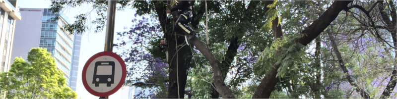 Life in any city is no paradise, and decisions must be made to manage the delicate balance between the needs of wildlife and the needs of the populace. Perhaps rarer than the sight of a yearly Jacarandá blossom is the sight of humans working to prevent them from falling on passing cars and possibly producing fatal or injurious car accidents on the main avenues. Such an activity is rare due to the time it takes for a tree to grow itself into such a predicament. Plants in the gardens are tagged and inventoried.